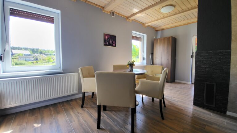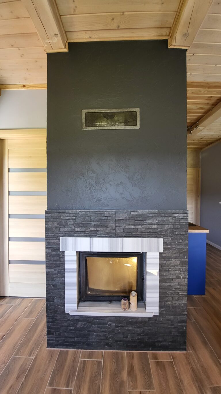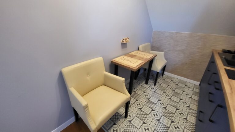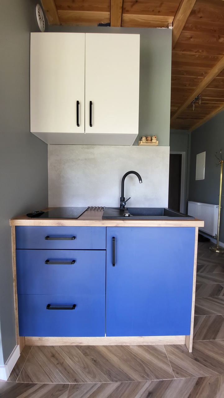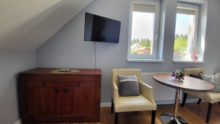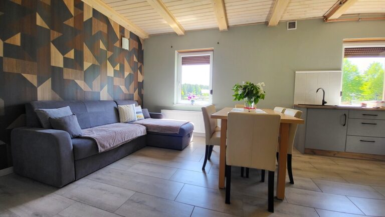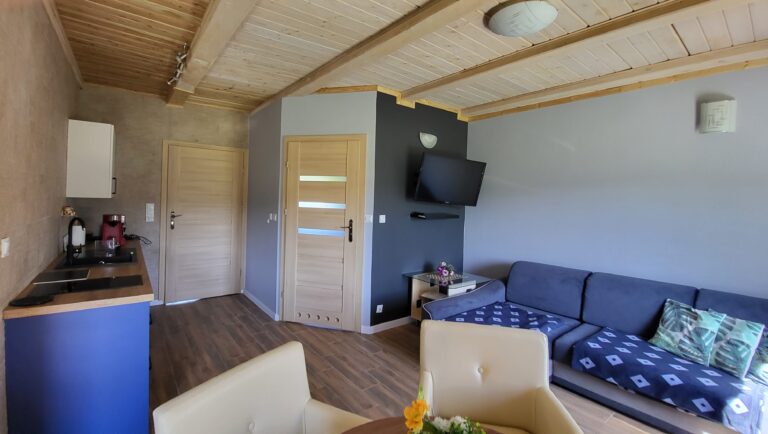 - Zawiera salon z kominkiem, aneks kuchenny z lodówką i mikrofalą, małą sypialnię, łazienkę z prysznicem.