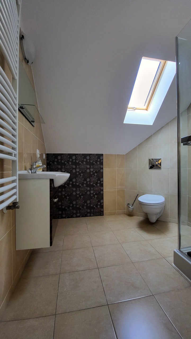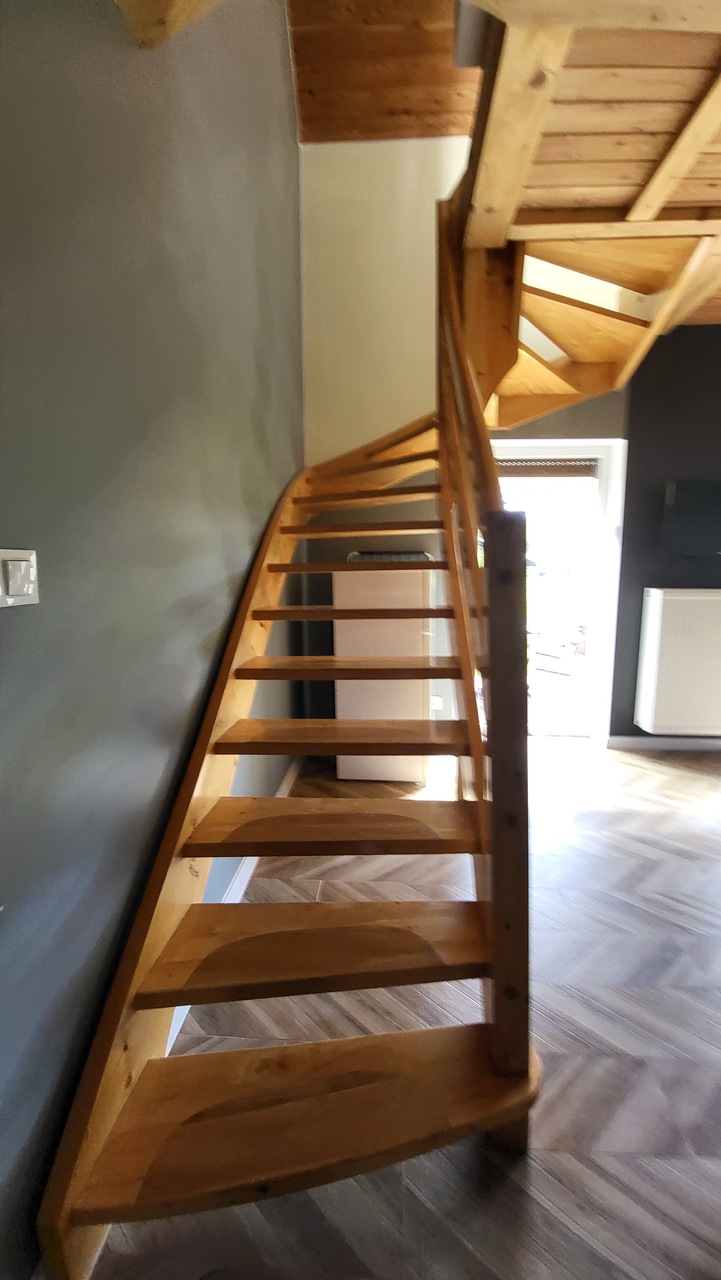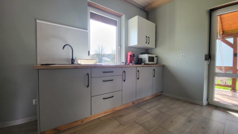 - Na parterze znajdują się salon z rozkładaną kanapą, TV, aneks kuchenny, łazienka z prysznicem i pralka, wyjście na taras.