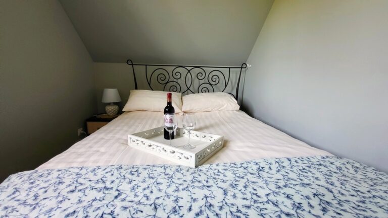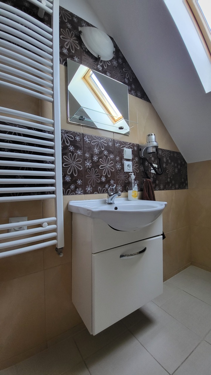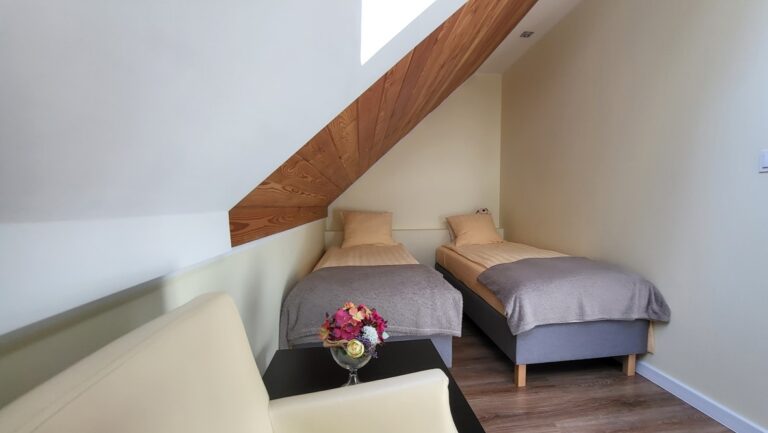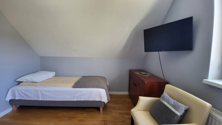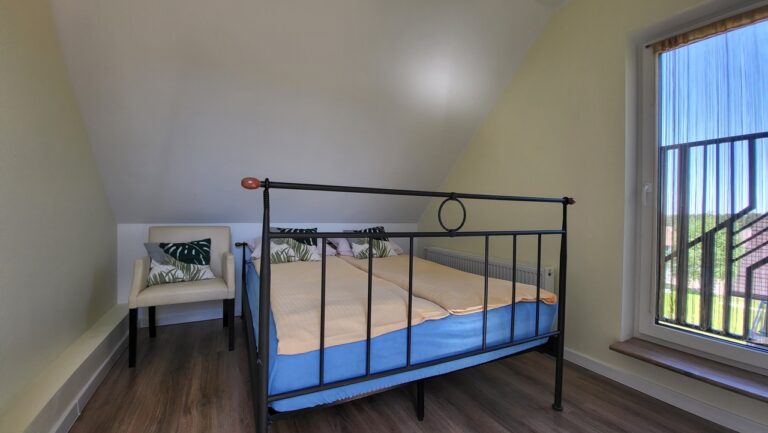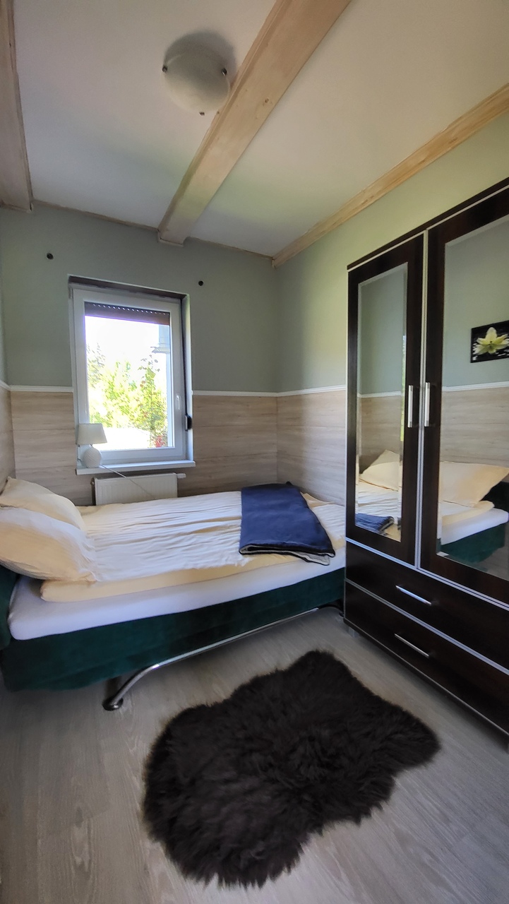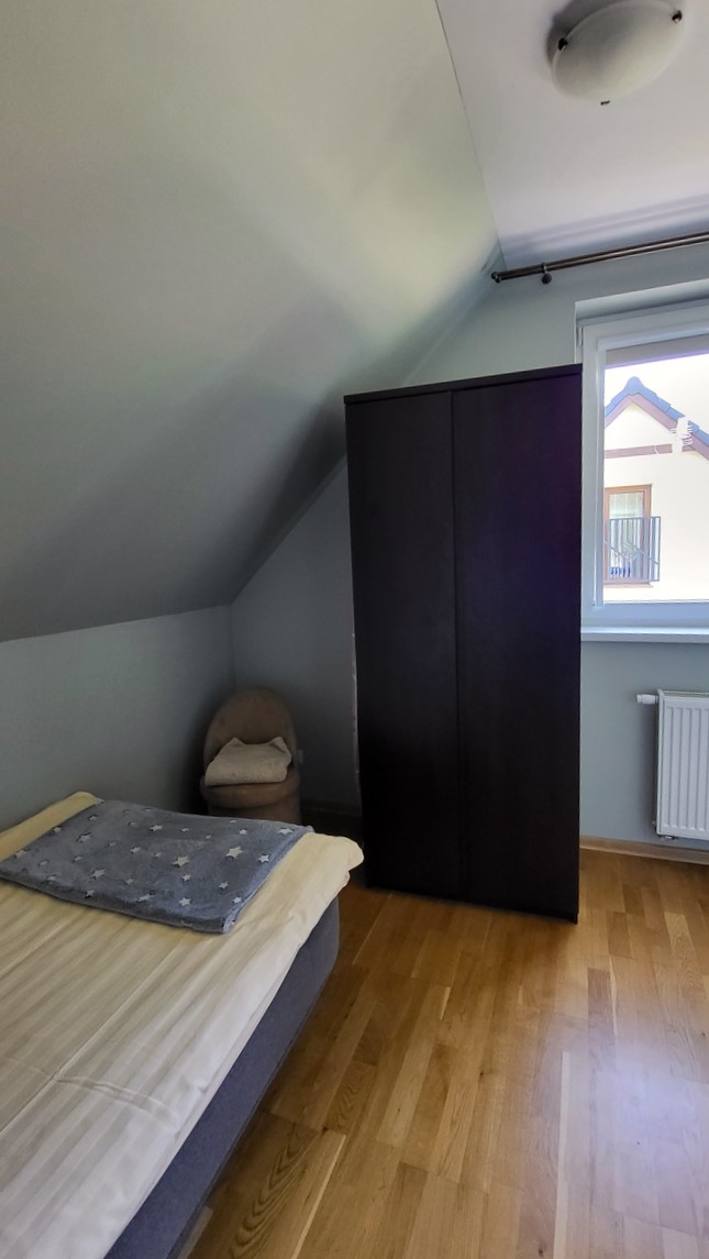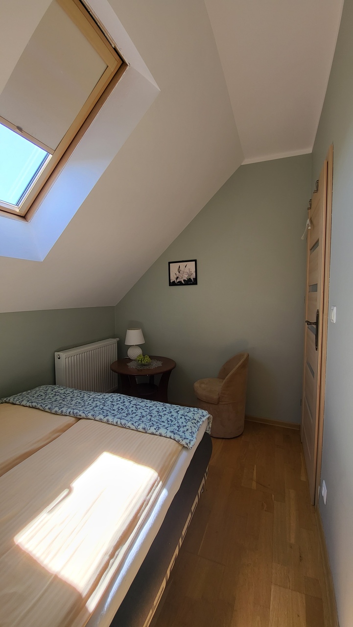 - Na piętrze znajduje się sypialnia z podwójnym łóżkiem i antresola z dwoma pojedynczymi łóżkami.