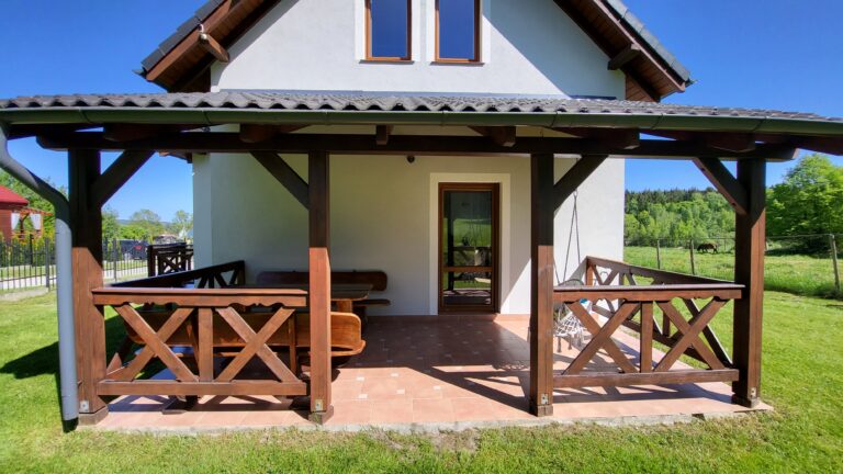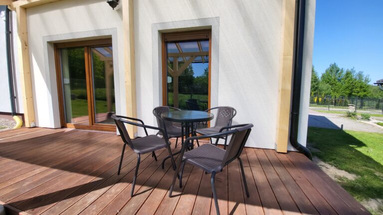 - Apartament ma wyjście na werandę, na której znajduje się masywny drewniany stół z ławkami do siedzenia oraz hamak.